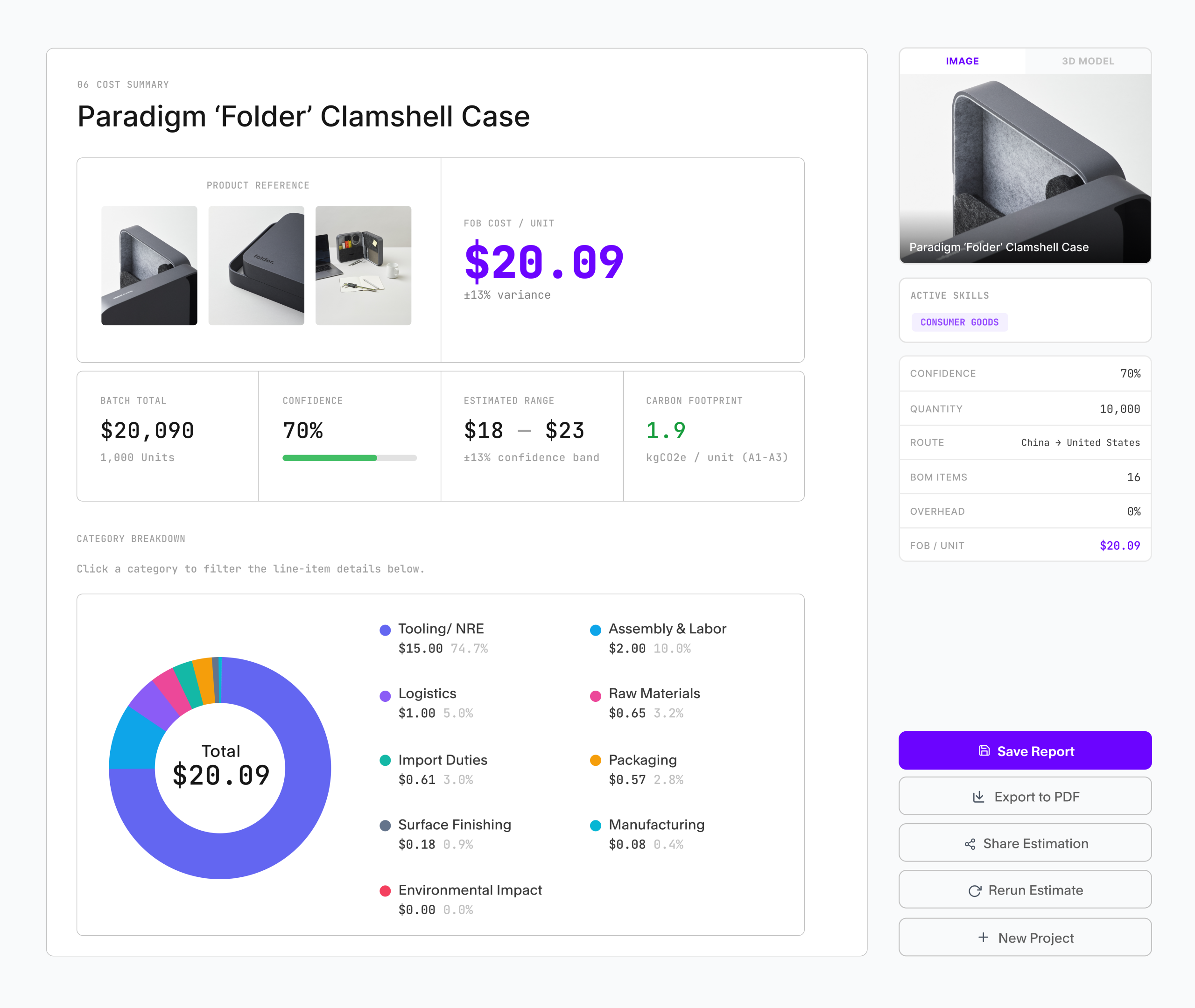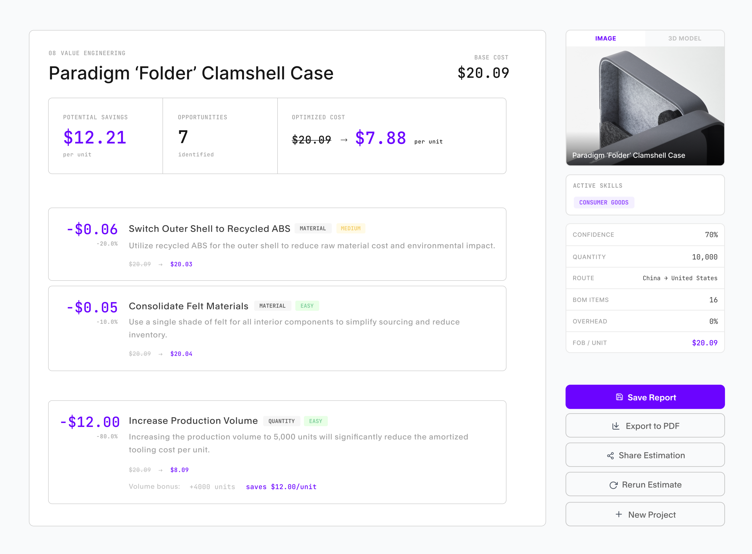 Having cost reports at our fingertips meant we could go back to suppliers with informed costs and feasible designs, allowing us to benchmark and secure better final quotes. We turned weeks of back-and-forth into minutes of work, and as a result, kept everything on track and aligned with our goals.