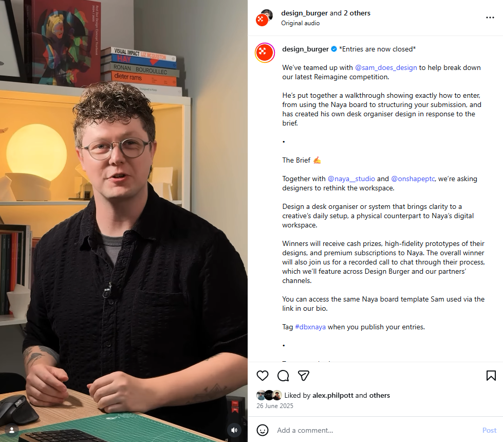 To spark inspiration across the community, we partnered with design influencer Sam Gwilt (@sam_does_design) to narrate his journey of designing a desk organizer and to demonstrate the power of using Naya and Onshape together. By sharing his process of going from initial idea to completed design with his audience of over 46,000 designers, Sam highlighted the core goals of the challenge and provided a practical blueprint for the community to tell their own design stories.